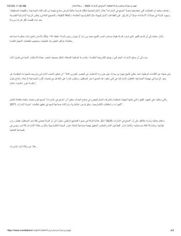 ىؤر لﺿﻔﺑ ،لﺑﻘﺗﺳﻣﻟا وﺣﻧ ﺔﻘﺛﺑ ﻲﺿﻣﺗ ﺔﻟودﻟا نأ ﻰﻟإ ًارﯾﺷﻣ ،ﻲﻧطوﻟا ﻊﯾﻧﺻﺗﻟا ةرﯾﺳﻣ ﻲﻓ ﺔﻗرﺎﻓ ﺔﻣﻼﻋ لّﻛﺷ ”2025 تارﺎﻣﻹا ﻲﻓ ﻊﻧﺻا“ نأ ﻰﻠﻋ دﯾﻛﺄﺗﻟﺎﺑ ﮫﺗرﺎﯾز ﮫﯾﻟﺎﻌﻣ مﺗﺗﺧاو