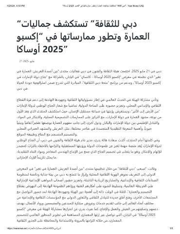 5/26/25, 4:59 PM "ﺎﻛﺎﺳوأ 2025 وﺑﺳﻛإ" ﻲﻓ ﺎﮭﺗﺎﺳرﺎﻣﻣ روطﺗو ةرﺎﻣﻌﻟا تﺎﯾﻟﺎﻣﺟ فﺷﻛﺗﺳﺗ "ﺔﻓﺎﻘﺛﻠﻟ ﻲﺑد" - Nas News UAE