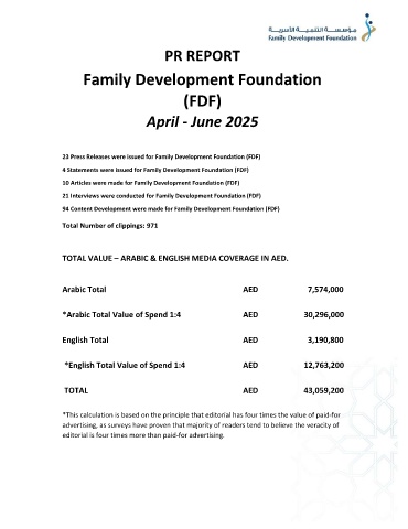 TOTAL VALUE – ARABIC & ENGLISH MEDIA COVERAGE IN AED.