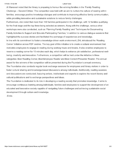 Al Mansoori noted that the library is preparing to honour the winning families in the ‘Family Reading