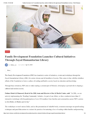 4/15/25, 10:58 AM Family Development Foundation launches cultural initiatives through Zayed Humanitarian Library | Web Release