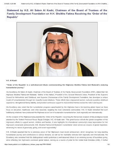 6/10/25, 9:24 AM Statement by H.E. Ali Salem Al Kaabi, Chairman of the Board of Trustees of the Family Development Foundation on H.H. Sheikha …