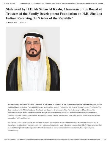 6/10/25, 9:26 AM Statement by H.E. Ali Salem Al Kaabi, Chairman of the Board of Trustees of the Family Development Foundation on H.H. Sheikha …