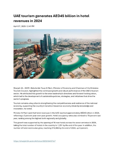 Minister Al Marri said that hotel revenues in the UAE reached approximately AED45 billion in 2024,