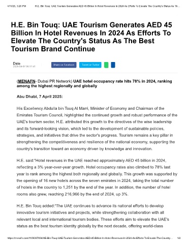 https://menafn.com/1109397834/HE-Bin-Touq-UAE-Tourism-Generates-AED-45-Billion-In-Hotel-Revenues-In-2024-As-Efforts-To-Elevate-The-Country… 1/2