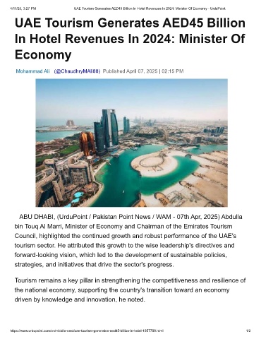 4/11/25, 3:27 PM UAE Tourism Generates AED45 Billion In Hotel Revenues In 2024: Minister Of Economy - UrduPoint