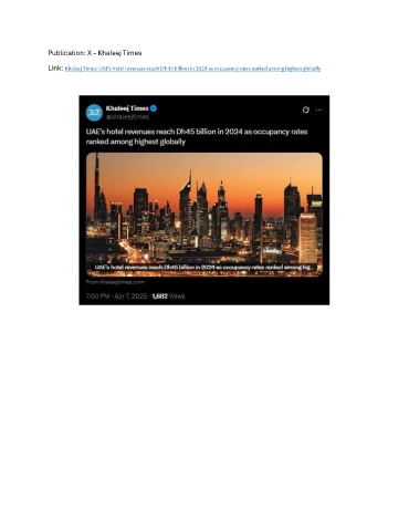 Publication: X – Khaleej Times Link: Khaleej Times: UAE's hotel revenues reach Dh45 billion in 2024 as occupancy rates ranked among highest globally