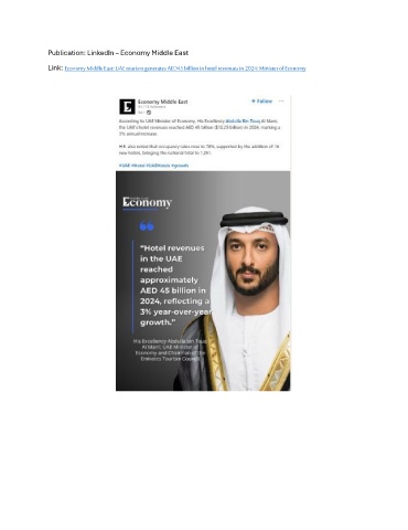 Publication: LinkedIn – Economy Middle East Link: Economy Middle East: UAE tourism generates AED45 billion in hotel revenues in 2024: Minister of Economy