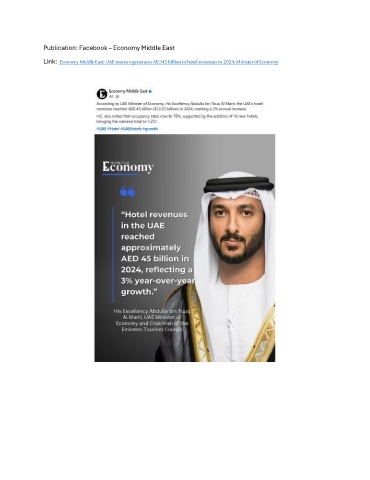 Publication: Facebook – Economy Middle East Link: Economy Middle East: UAE tourism generates AED45 billion in hotel revenues in 2024: Minister of Economy