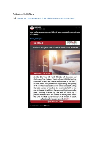 Publication: X – UAE Barq Link: UAE Barq: UAE tourism generates AED45 billion in hotel revenues in 2024: Minister of Economy