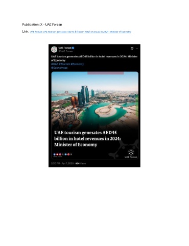 Publication: X – UAE Forsan Link: UAE Forsan: UAE tourism generates AED45 billion in hotel revenues in 2024: Minister of Economy