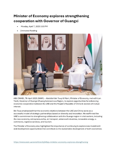 ABU DHABI, 7th April 2025 (WAM) -- Abdullah bin Touq Al Marri, Minister of Economy, met with Lan