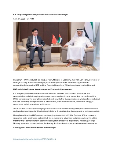 Sharjah24 – WAM: Abdullah bin Touq Al Marri, Minister of Economy, met with Lan Tianli, Governor of