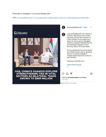 Publication: Instagram – Economy Middle East Link: Economy Middle East: UAE, China’s Guangxi explore strengthening ties in vital sectors as bilateral trade grows to $969 million
