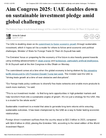 4/14/25, 4:29 PM Aim Congress 2025: UAE doubles down on sustainable investment pledge amid global challenges | The National