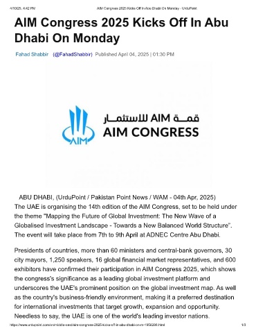 4/10/25, 4:42 PM AIM Congress 2025 Kicks Off In Abu Dhabi On Monday - UrduPoint