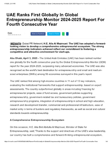 4/10/25, 2:51 PM UAE Ranks First Globally In Global Entrepreneurship Monitor 2024-2025 Report For Fourth Consecutive Year