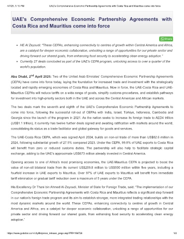 4/7/25, 5:15 PM UAE's Comprehensive Economic Partnership Agreements with Costa Rica and Mauritius come into force