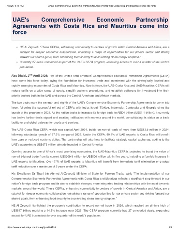 4/7/25, 5:16 PM UAE's Comprehensive Economic Partnership Agreements with Costa Rica and Mauritius come into force