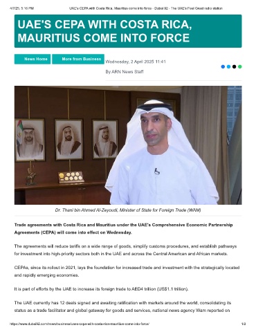 4/7/25, 5:16 PM UAE's CEPA with Costa Rica, Mauritius come into force - Dubai 92 - The UAE's Feel Great radio station