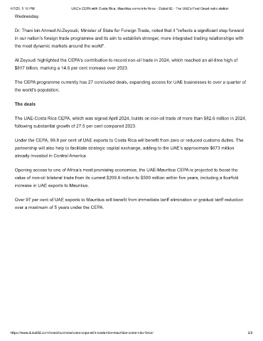 4/7/25, 5:16 PM UAE's CEPA with Costa Rica, Mauritius come into force - Dubai 92 - The UAE's Feel Great radio station