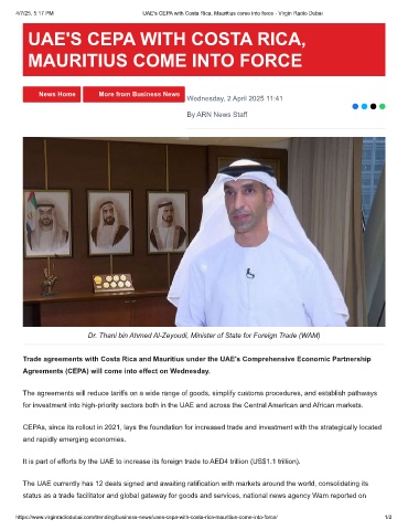 4/7/25, 5:17 PM UAE's CEPA with Costa Rica, Mauritius come into force - Virgin Radio Dubai