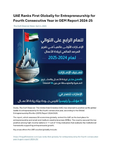 https://thegulfobserver.com/uae-ranks-first-globally-for-entrepreneurship-for-fourth-consecutive-