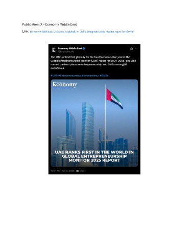Publication: X – Economy Middle East Link: Economy Middle East: UAE ranks 1st globally in Global Entrepreneurship Monitor report for 4th year