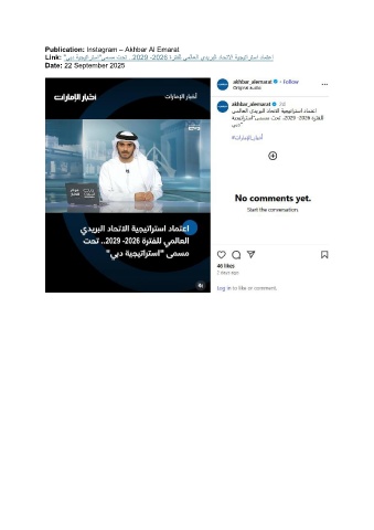 Publication: Instagram – Akhbar Al Emarat Link: "يبد ةيجيتارتسا"ىمسم تحت ..2029 -2026 ةرتفلل يملاعلا يديربلا داحتلاا ةيجيتارتسا دامتعا Date: 22 September 2025