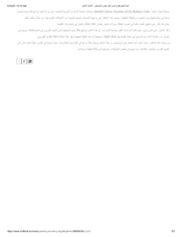 ناوﻧﻌﺑ ةدﯾدﺟ ﺔﯾﻛرﯾﻣأ عارﺗﺧا ةءارﺑ ﻰﻠﻋ ،ةدﺣﺗﻣﻟا ﺔﯾﺑرﻌﻟا تارﺎﻣﻹا ﺔﻌﻣﺎﺟ تﻠﺻﺣ «Metal-Carbon Dioxide (CO2) Battery Cell»، ً ﺎﯾﻣﻠﻋ ًازﺎﺟﻧإ ﺔﻠﺟﺳﻣ