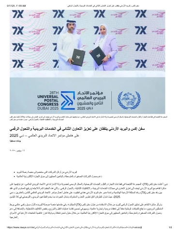 سﻛإ نﻔﺳ تﻧﻠﻋأ (7X)، تﻻﺎﺟﻣ ﻲﻓ نوﺎﻌﺗﻟا زﯾزﻌﺗ ﻰﻟإ فدﮭﺗ ﻲﻧدرﻷا دﯾرﺑﻟا ﻊﻣ مھﺎﻔﺗ ةرﻛذﻣ ﻰﻠﻋ ﺎﮭﻌﯾﻗوﺗ نﻋ ،ﻲﻣﻟﺎﻌﻟا يدﯾرﺑﻟا دﺎﺣﺗﻻا ﻲﻓ تارﺎﻣﻹا ﺔﻟود ﺔﯾوﺿﻌﻟ ﻲﻣﺳرﻟا لﺛﻣﻣﻟاو ﺔﯾﺗﺳﺟوﻠﻟا تﺎﻣدﺧﻟاو لﻘﻧﻟاو ةرﺎﺟﺗﻟا تﺎﻋﺎطﻗ ﻲﻓ ﺔﺿﺑﺎﻘﻟا ﺔﻋوﻣﺟﻣﻟا