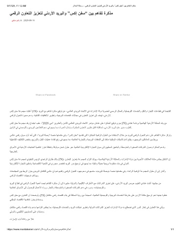 9/17/25, 11:12 AM مﻼﺳﻟا ﺔﻟﺎﺳر – ﻲﻣﻗرﻟا نوﺎﻌﺗﻟا زﯾزﻌﺗﻟ ﻲﻧدرﻷا دﯾرﺑﻟاو ”سﻛإ نﻔﺳ“ نﯾﺑ مھﺎﻔﺗ ةرﻛذﻣ