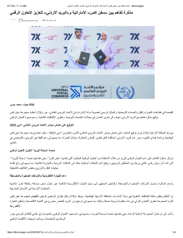 ﻲﻤﻗﺮﻟا نوﺎﻌﺘﻟا ﺰﯾﺰﻌﺘﻟ «ﻲﻧدرﻷا ﺪﯾﺮﺒﻟا»و ﺔﯿﺗارﺎﻣﻹا «ﺲﻛإ ﻦﻔﺳ» ﻦﯿﺑ ﻢھﺎﻔﺗ ةﺮﻛﺬﻣ