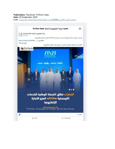 Publication: Facebook- FinTech Gate Date: 09 September 2025 Link: « ةيتسجوللا تامدخلل ةينطولا ةكبشلا قلطت تاراملإاNXN ةينورتكللإا ةراجتلا زيزعتل »
