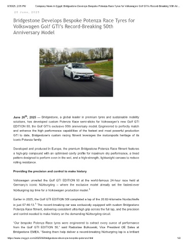 6/30/25, 2:05 PM Company News in Egypt: Bridgestone Develops Bespoke Potenza Race Tyres for Volkswagen Golf GTI’s Record-Breaking 50th An…