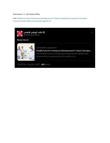 Publication: X – AD Media Office Link: Khalifa Fund for Enterprise Development’s Future Entrepreneur programme fosters entrepreneurial skills among youth aged 6-18