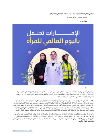 ن م اهيلإ دنسُي ام لكو اهماهم ءادأ يف اهزيمتو ةيتاراملإا ةأرملا حاجن نإ ةأرملل يملاعلا مويلا ةبسانمب اهل حيرصت يف اهتداعس تلاقو