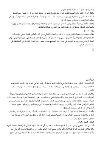 ﺎﻫدﻮﻬﺟ ﻞﻀﻔﺑ ﺮﻤﺘﺴﻣ تارﺎﻣﻹا رﺎﻫدزاو ،ﺔﻟاﺪﻌﻟاو ﺔﻴﻤﻨﺘﻟا ةﺮﻴﺴﻣ ﻓ ﺔﻴﺳﺎﺳأ ةﺰﻴﻛر ﻞﻈﺘﺳ ةأﺮﻤﻟا نأ ﺪﻴﻛﺄﺘﺑ ﻢﺘﺘﺧاو