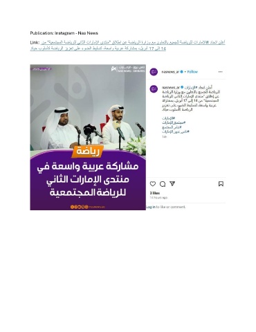 Publication: Instagram - Nas News Link: نم "ةيعمتجملا ةضايرلل يناثلا تاراملإا ىدتنم" قلاطإ نع ةضايرلا ةرازو عم نواعتلاب عيمجلل ةضايرلل تاراملإا# داحتا نلعأ .ةايح بولسأك ةضايرلا زيزعت ىلع ءوضلا طيلستل ،ةعساو ةيبرع ةكراشمب ،ليربأ 17 ىلإ 14