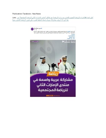Publication: Facebook – Nas News Link: نم "ةيعمتجملا ةضايرلل يناثلا تاراملإا ىدتنم" قلاطإ نع ةضايرلا ةرازو عم نواعتلاب عيمجلل ةضايرلل تاراملإا# داحتا نلعأ ةايح بولسأك ةضايرلا زيزعت ىلع ءوضلا طيلستل ،ةعساو ةيبرع ةكراشمب ،ليربأ 17 ىلإ 14.