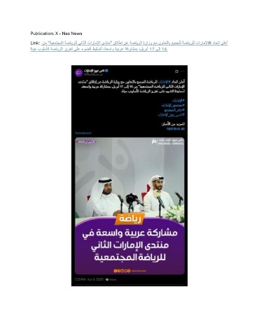 Publication: X – Nas News Link: نم "ةيعمتجملا ةضايرلل يناثلا تاراملإا ىدتنم" قلاطإ نع ةضايرلا ةرازو عم نواعتلاب عيمجلل ةضايرلل تاراملإا# داحتا نلعأ ةايح بولسأك ةضايرلا زيزعت ىلع ءوضلا طيلستل ،ةعساو ةيبرع ةكراشمب ،ليربأ 17 ىلإ 14.