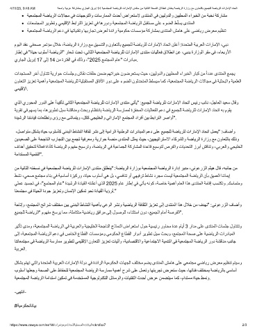 ،لﺻاوﺗﻣ لﻛﺷﺑ ةﺎﯾﺣ بوﻠﺳﺄﻛ ﻲﻧدﺑﻟا طﺎﺷﻧﻟا ﺔﻓﺎﻘﺛ رﺷﻧ ﻰﻟإ ﺔﯾﻣارﻟا ﺔﯾﻧطوﻟا تاردﺎﺑﻣﻟا مﻋد ﻰﻠﻋ ﻊﯾﻣﺟﻠﻟ ﺔﺿﺎﯾرﻠﻟ تارﺎﻣﻹا دﺎﺣﺗا لﻣﻌﯾ" :فﺎﺿأو