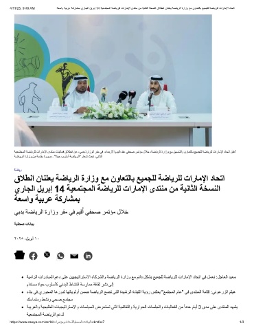 4/11/25, 9:48 AM ﺔﻌﺳاو ﺔﯾﺑرﻋ ﺔﻛرﺎﺷﻣﺑ يرﺎﺟﻟا لﯾرﺑإ 14 ﺔﯾﻌﻣﺗﺟﻣﻟا ﺔﺿﺎﯾرﻠﻟ تارﺎﻣﻹا ىدﺗﻧﻣ نﻣ ﺔﯾﻧﺎﺛﻟا ﺔﺧﺳﻧﻟا قﻼطﻧا نﺎﻧﻠﻌﯾ ﺔﺿﺎﯾرﻟا ةرازو ﻊﻣ نوﺎﻌﺗﻟﺎﺑ ﻊﯾﻣﺟﻠﻟ ﺔﺿﺎﯾرﻠﻟ تارﺎﻣﻹا دﺎﺣﺗا