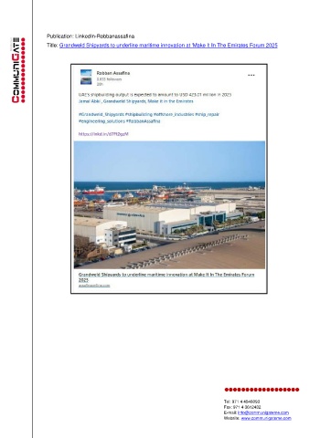 Publication: LinkedIn-Robbanassafina Title: Grandweld Shipyards to underline maritime innovation at 'Make It In The Emirates Forum 2025 Tel: 971 4 4546093 Fax: 971 4 3612432 E-mail: info@communigateme.com Website: www.communigateme.com