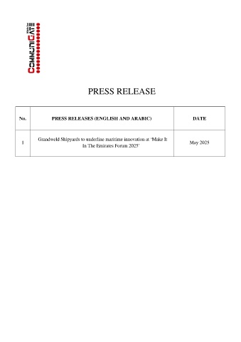 PRESS RELEASE No. PRESS RELEASES (ENGLISH AND ARABIC) DATE Grandweld Shipyards to underline maritime innovation at ‘Make It 1 May 2025 In The Emirates Forum 2025’