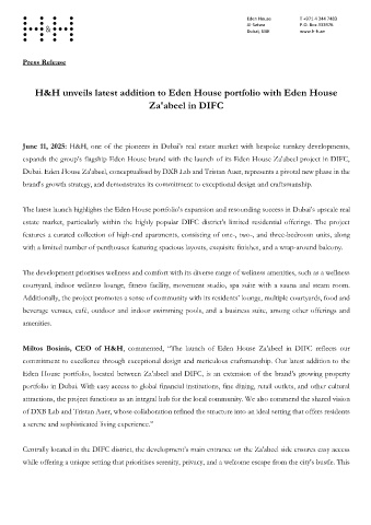 Miltos Bosinis, CEO of H&H, commented, “The launch of Eden House Za'abeel in DIFC reflects our