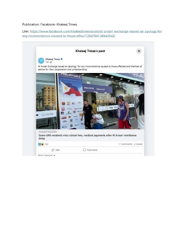 Publication: Facebook- Khaleej Times Link: https://www.facebook.com/khaleejtimes/posts/al-ansari-exchange-issued-an-apology-for- any-inconvenience-caused-to-those-affec/1264766138643542/