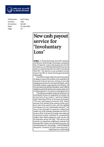 Publication: Gulf Today Country: UAE Circulation: 49,500 Date: 21 July 2025 Page: 14