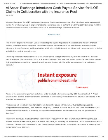7/21/25, 9:15 AM Al Ansari Exchange Introduces Cash Payout Service for ILOE Claims in Collaboration with the Insurance Pool - Middle East Busine…