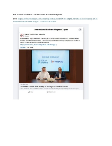 Publication: Facebook – International Business Magazine Link: https://www.facebook.com/intlbm/posts/blue-remit-the-digital-remittance-subsidiary-of-al- ansari-financial-services-pjs/1170908015055658/